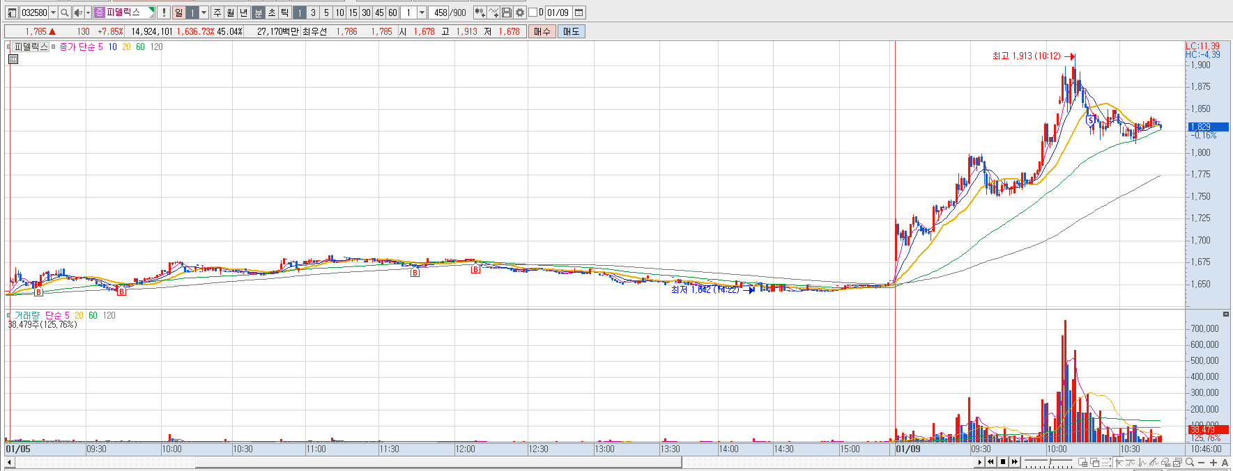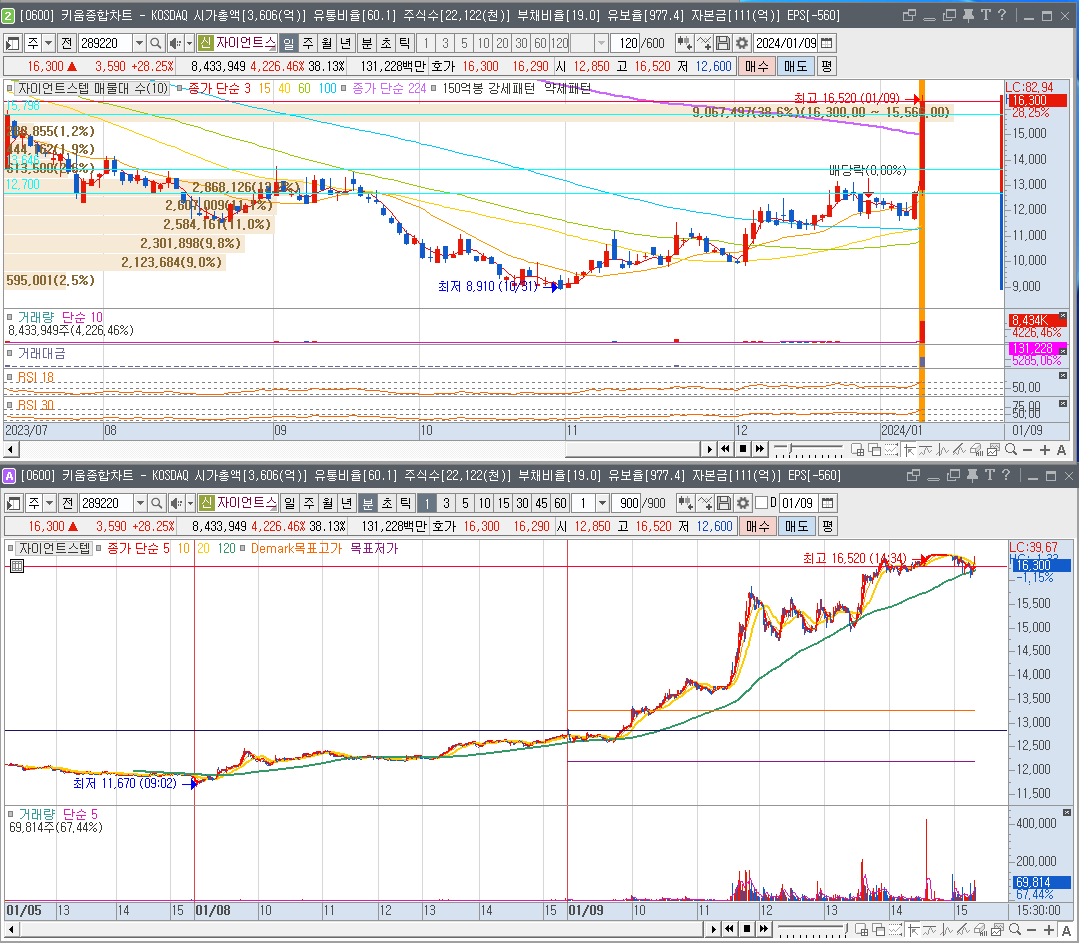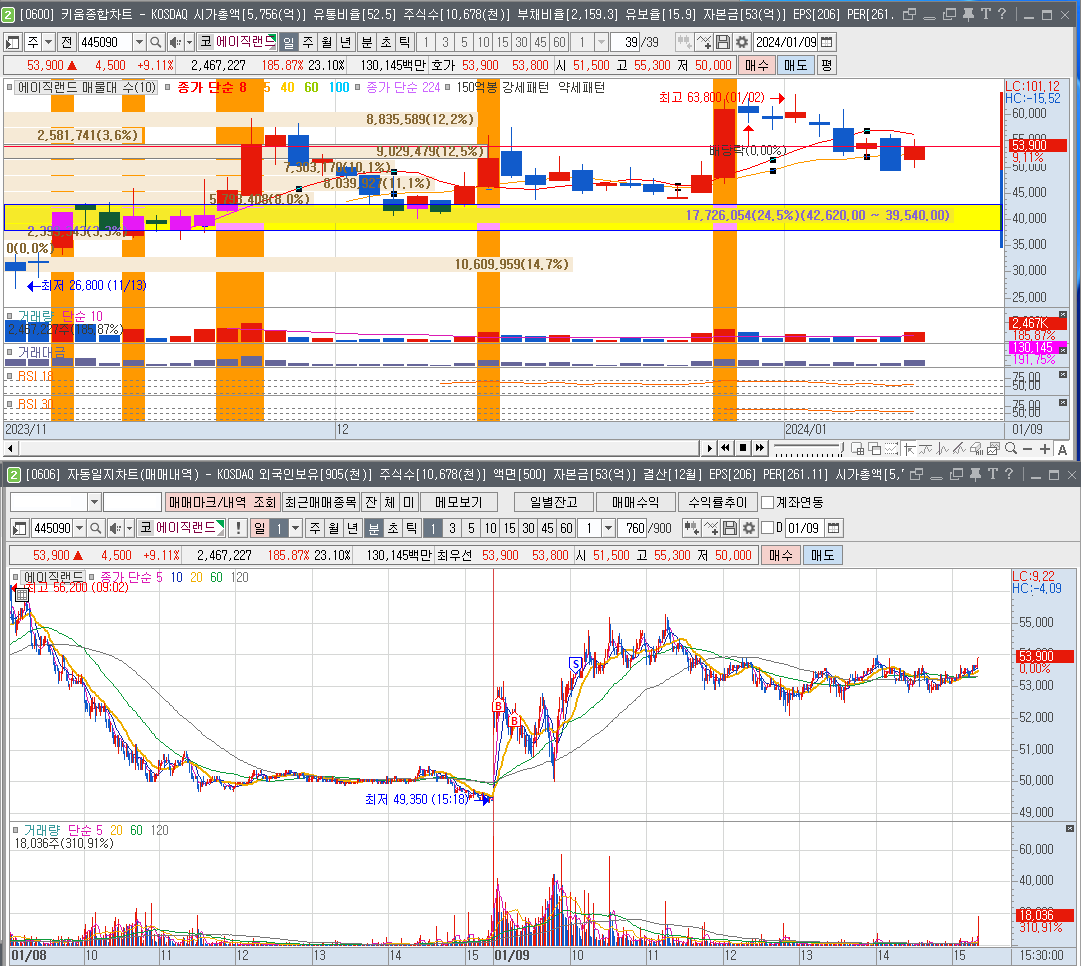 | AI와 메타버스 관련주들이 강세였고 삼성의 부진한 실적발표로 삼성전자는 하락하였고, 온디바이스AI 관련 반도체주가 약간 상승하지만 부진한 흐름이었다. | 500억봉 이후 하락하고 있기에 조정으로 생각하고 접근하였다. |